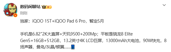 【CNMO科技消息】4月28日,数码博主@数码闲聊站 爆料称,iQOO旗下新一代性能旗舰iQOO 15T暂定5月登场,同时iQOO Pad 6 Pro也将在同期亮相,两款新品均以旗舰性能和大屏体验为核心卖点。