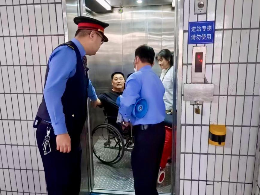 郑瑞鑫协助旅客下车与车站办理交接手续。受访者供图