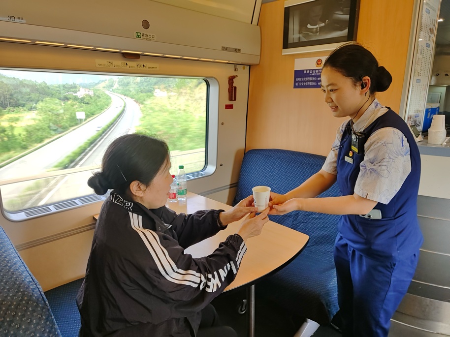 刘安琪为独自出行的年长旅客送水。受访者供图