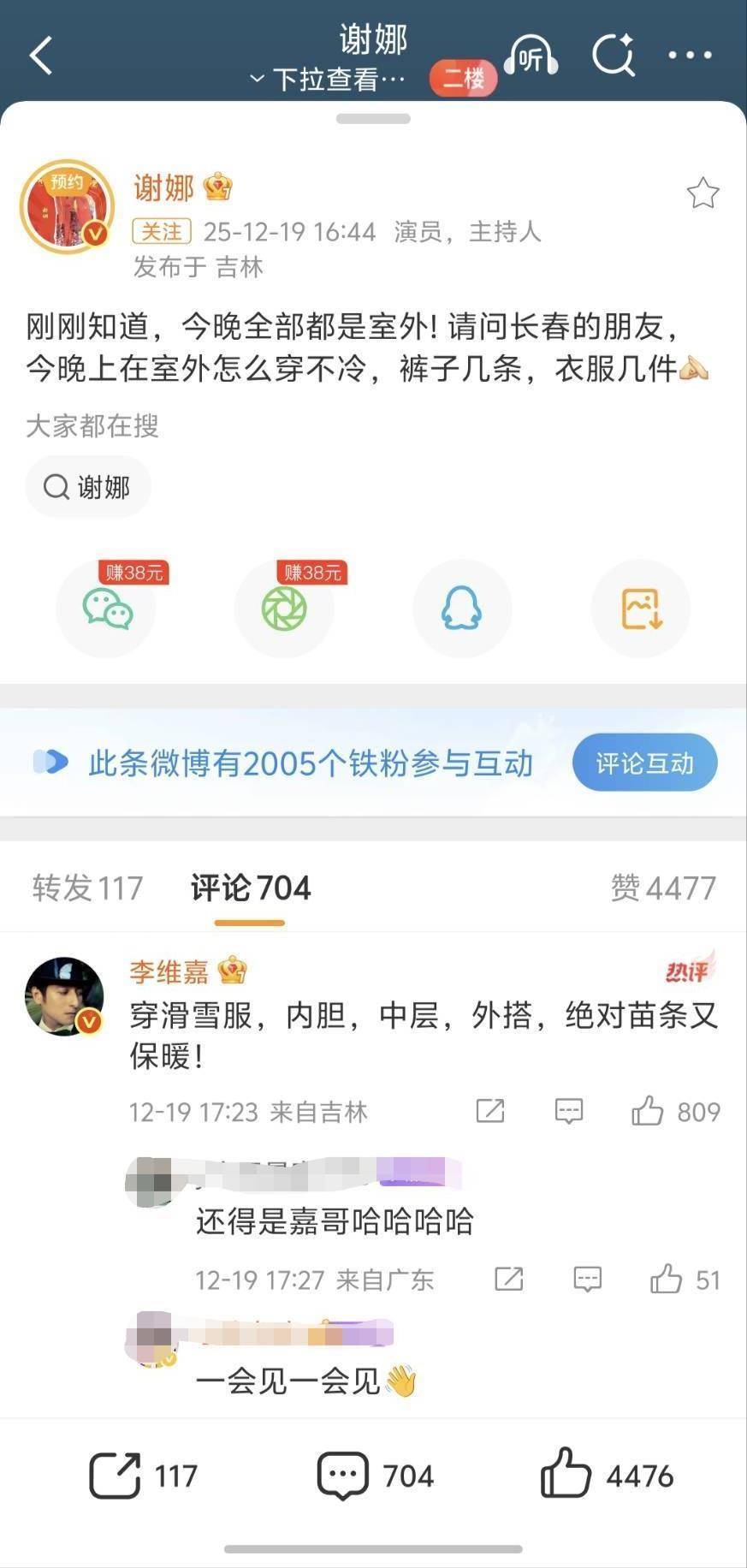 谢娜与李维嘉微博互动