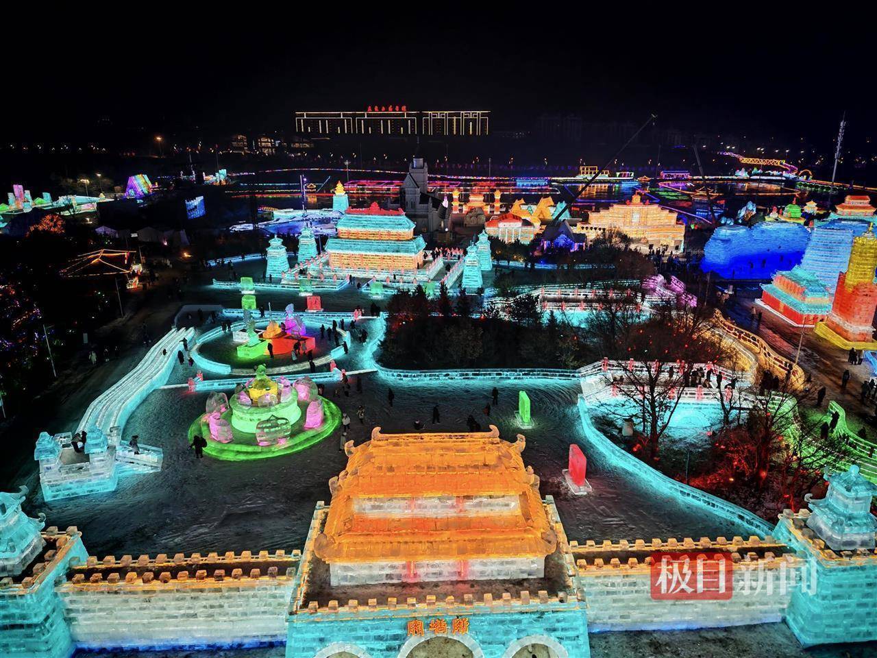 今年全新打造的长春冰雪新天地利用冰块惟妙惟肖地复刻了国内许多地标建筑,例如浙江雷峰塔、西安大雁塔、哈尔滨索菲亚大教堂、澳门银河酒店、重庆解放碑等,还有陈塘关、龙宫等特色元素,配合彩色射灯,吸引了不少游客打卡拍照。