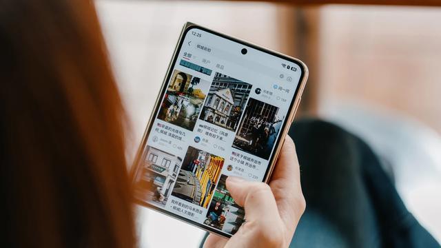 打开小红书,笔记卡片在 Pura X Max 的阔型外屏上可以多列排布,一屏里能同时扫过好几张笔记。图文流式内容的本质,本来就是在有限的时间里扫过更多选项、更快决定点开哪一篇——横向空间一旦宽裕,视觉扫描就会变得毫不费力。这种信息密度过去只属于大屏幕,现在一台可以单手握住的设备上也能轻松获得。